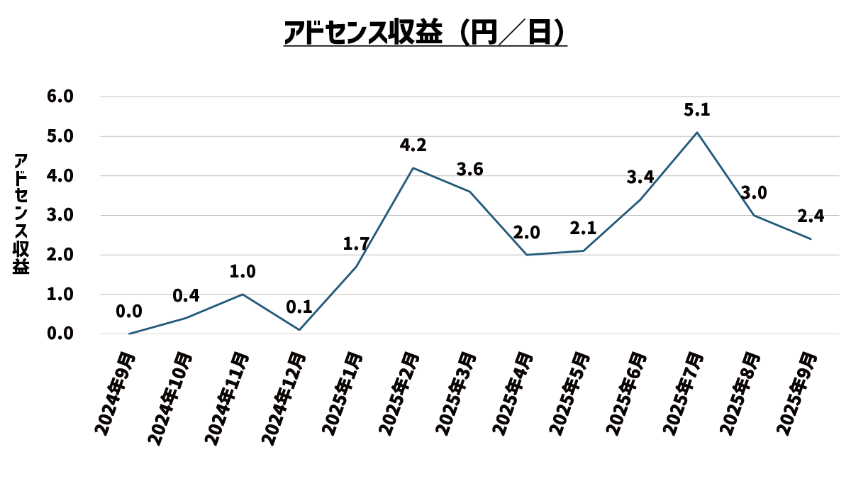 アドセンス収益は2025年7月が最も高かったですが単価が少ないので、PV数が多くない現段階では合計収益に対するアドセンス収益の寄与は小さくなります。