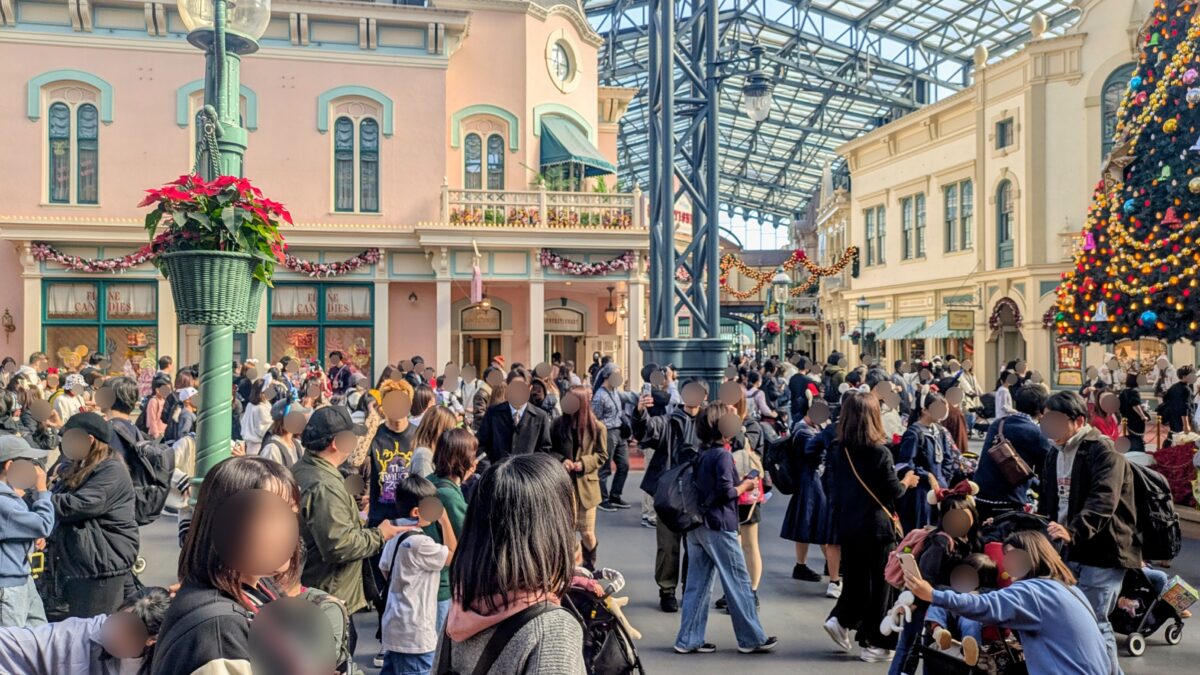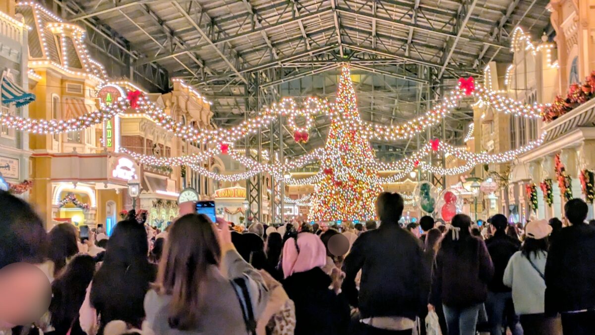 クリスマスイベントのためエントランスを通り抜けたワールドバザールにはクリスマスツリーが飾られていました。ツリーを撮影しようと多くのゲストがここで立ち止まっていたので、激混みでした。