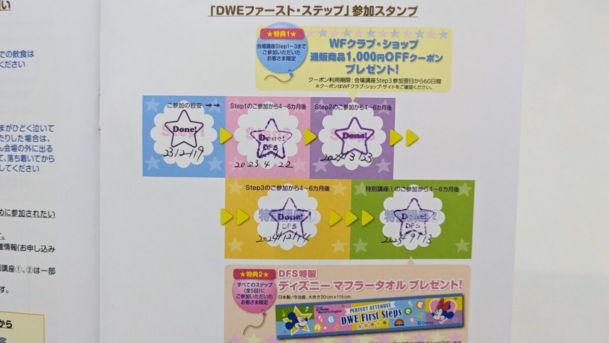 参加特典 | 特典1:WFCショップ1,000円OFF割引クーポン(Step3まで参加した方が対象) 特典2:DFS特製ディズニーマフラータオル |