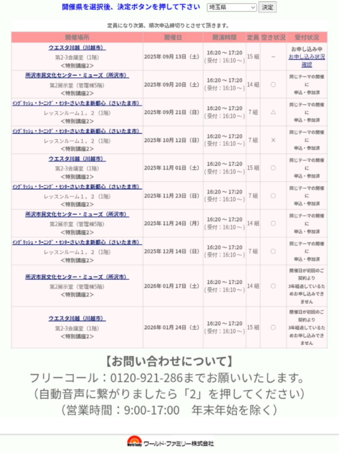 予約はWFユーザー・ウェブ・サイトから行うことができますが(予約方法は後述します)、直近の開催日程は予約が既に埋まってしまっていることが結構あります。