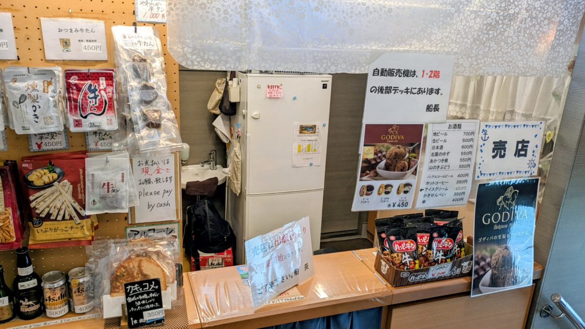 船内には1階から2階に上がる途中に売店があり、出航後に営業が開始されます。