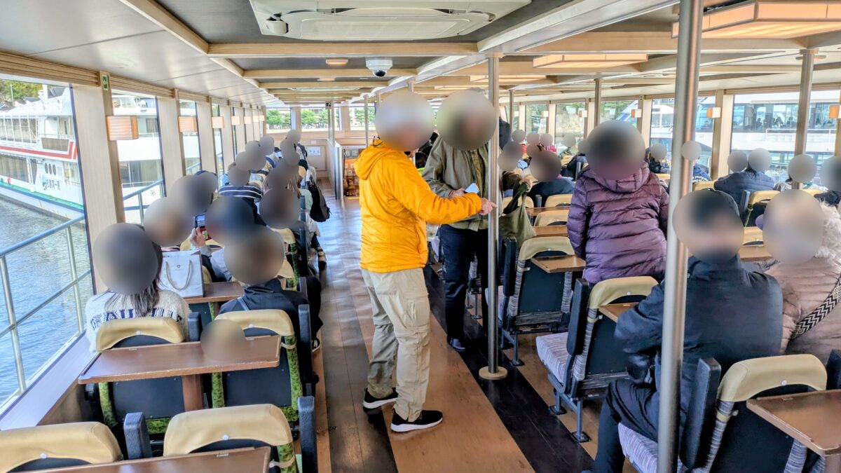 船内の席は左右の窓際席と中央席の3レーンに分かれています。観光船内は自由席となっており、桟橋に並んだ順で乗船するので、窓際に座りたい場合には早めに並びましょう。