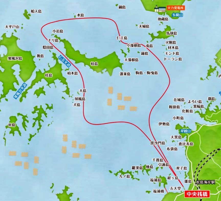 ①雄島→②双子島→③千貫島→④布袋島・恵比寿島・大黒島・毘沙門島→⑤伊勢島・小町島→⑥かぶと島→⑦箕輪島→⑧筆捨島→⑨馬の鞍掛島・化粧島→⑩在城島→⑪ドーラン島→⑫モンド島→⑬材木島→⑭火付島→⑮馬放島→⑯うさぎ島→⑰夫婦島→⑱鐘島→⑲小藻根島→⑳仁王島→㉑鍋島→㉒水島→㉓桂島→㉔石浜崎→㉕舟入島→㉖チリ島→㉗陰田島→㉘石浜水道→㉙石浜→㉚野々島→㉛寒風沢島→㉜大島→㉝屏風島→㉞犬島→㉟経々島→㊱福浦島→㊲福浦橋