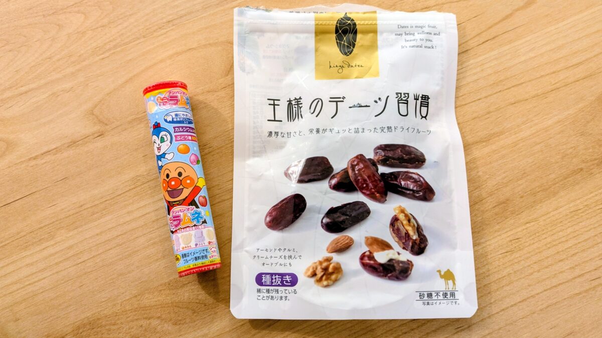 ミニろーはアンパンマンのラムネとドライデーツが好きで長時間のお出かけの時にはだいたい持参しています。