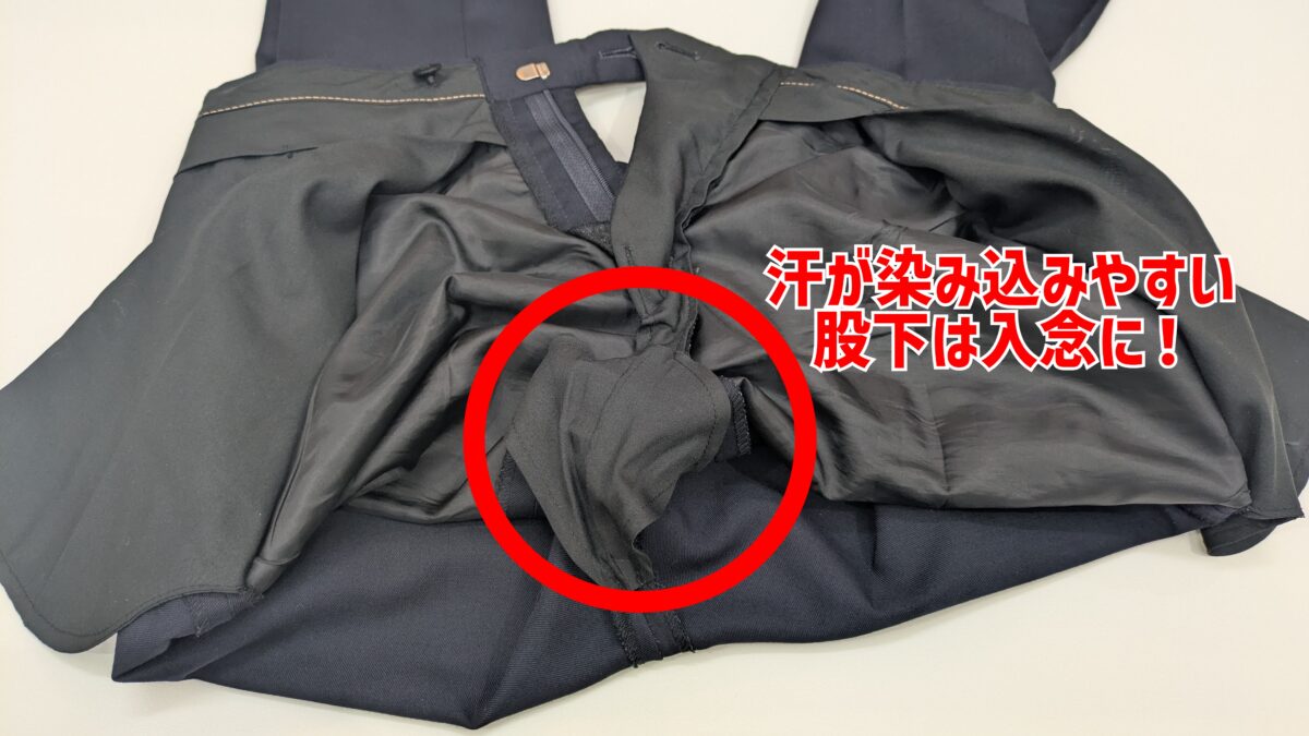 特に、スラックスは特に股下、ジャケットは脇に汗の臭いが染み込みやすいので、入念に押し洗いします。